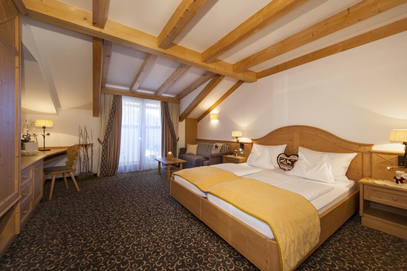 Junior Suite. Rustica o moderna, questa junior suite dispone di pavimenti in moquette, mobili in legno, stufa e balcone con tavolino, 2 sedie e vista sulle montagne. Il divano letto può ospitare fino a 2 ospiti aggiuntivi. ;