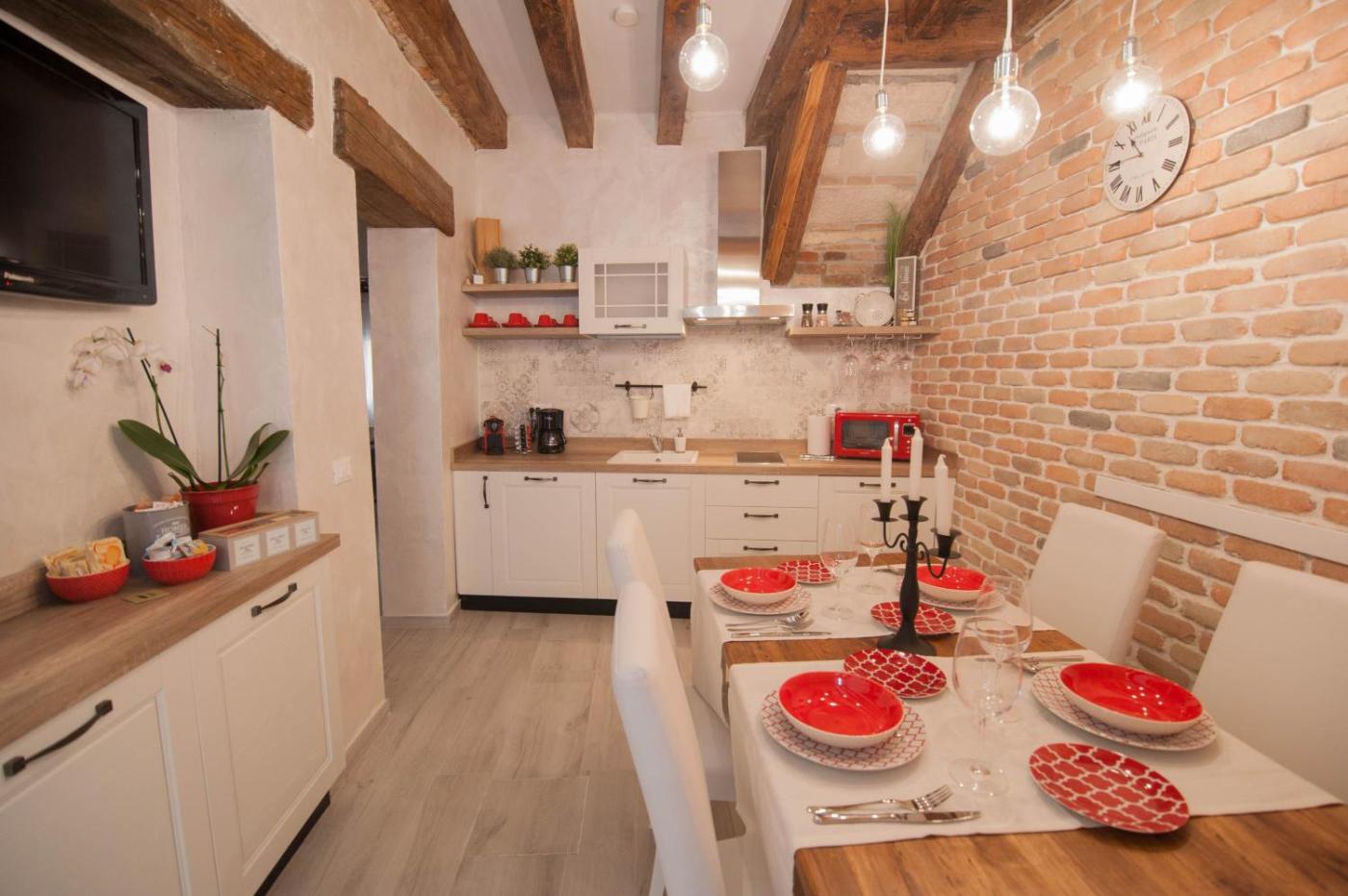 Questo appartamento dispone di 2 camere da letto, di 2 bagni e di una cucina completamente attrezzata, ed è caratterizzato da soffitti con travi in legno a vista e da pavimenti in legno.